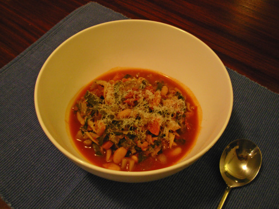Add the zucchini, tomatoes and wine, and simmer gently until it thickens slightly. Add the silverbeet, chicken stock, cannellini beans and pasta. Simmer until the pasta is cooked.