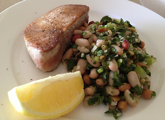 Combine the remaining ingredients and pine nuts in a bowl and toss to coat. Season to taste with salt and pepper, and serve with the tuna steaks.